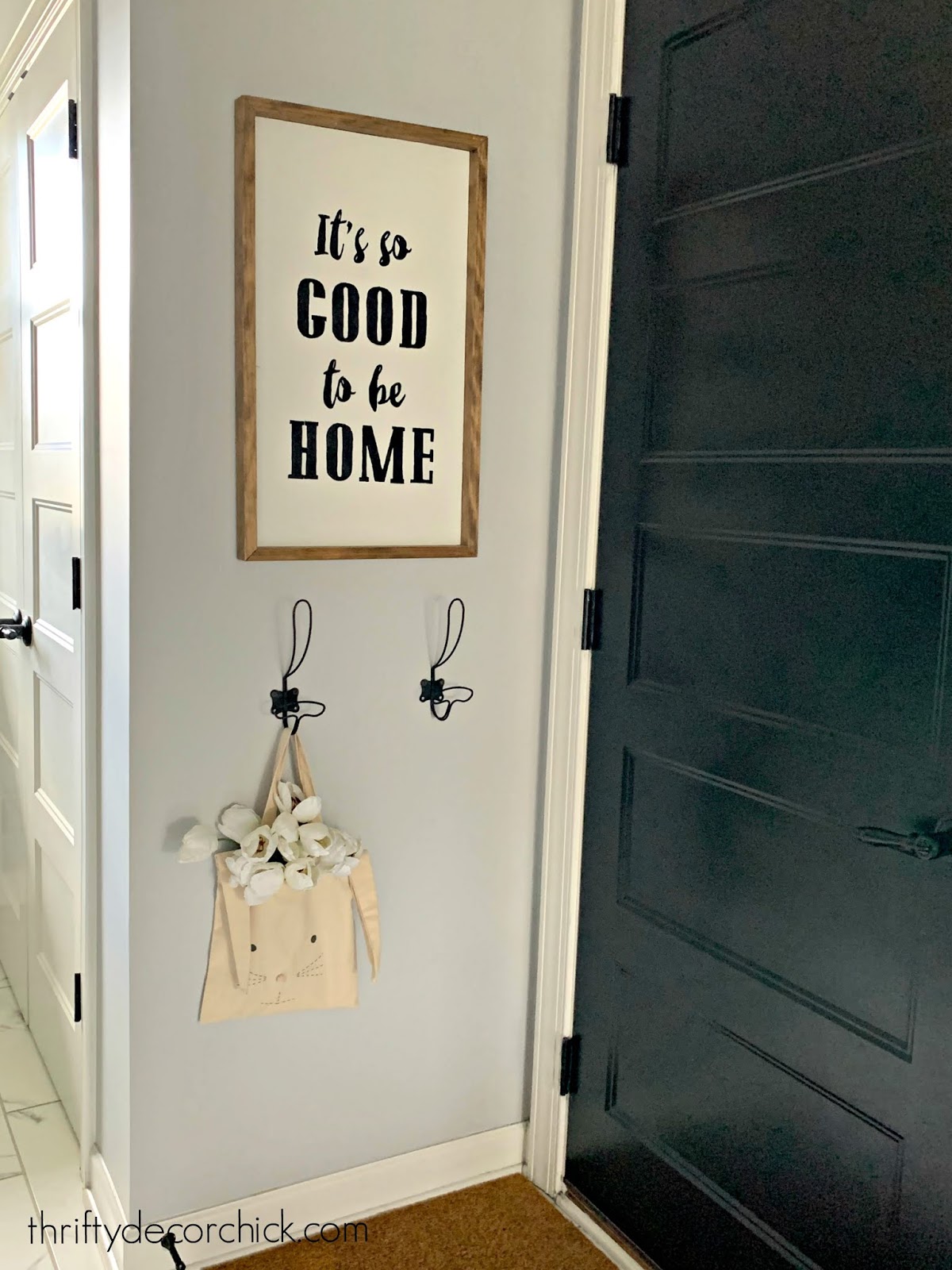 I think that little spring sign was from the Target dollar spot. I used a 3M command hook to hang it on the tile.