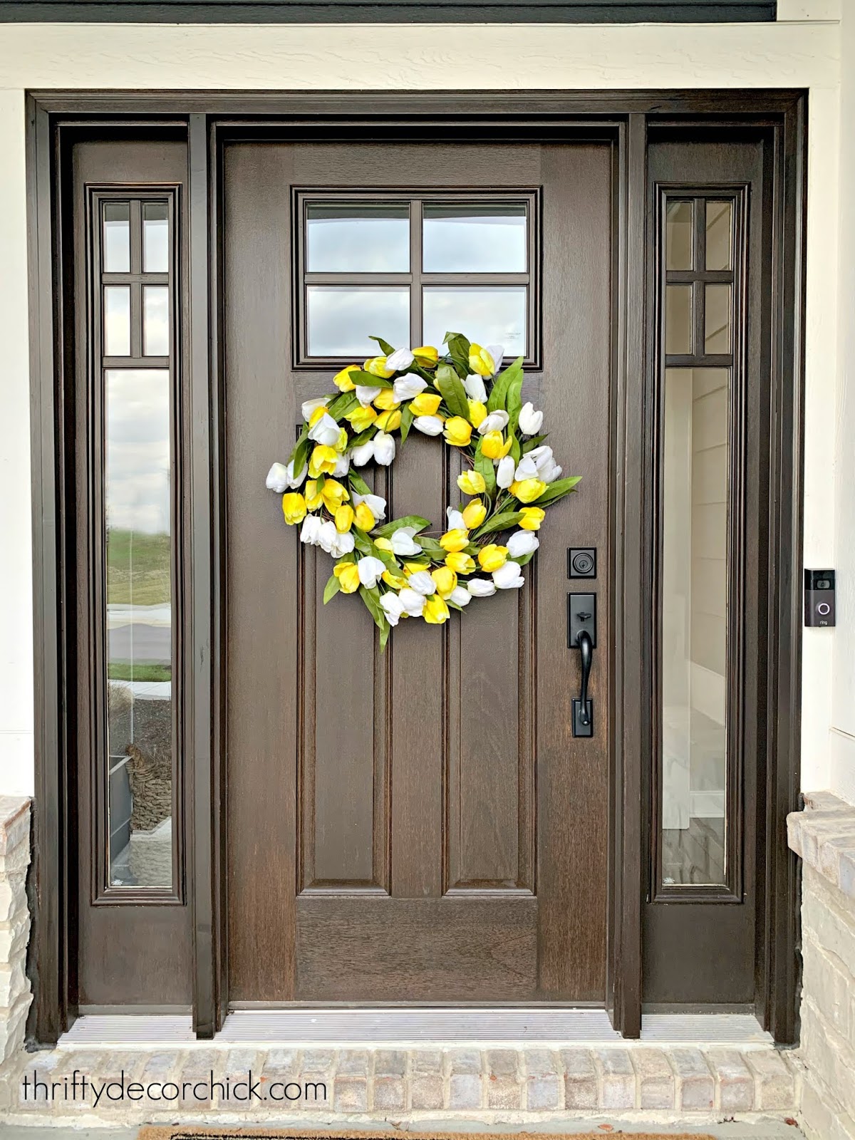 You may remember my love of the simple grapevine wreath and all the different ways I use it throughout the year. I took off the Christmas decor and added the faux tulips back for this super easy spring wreath: