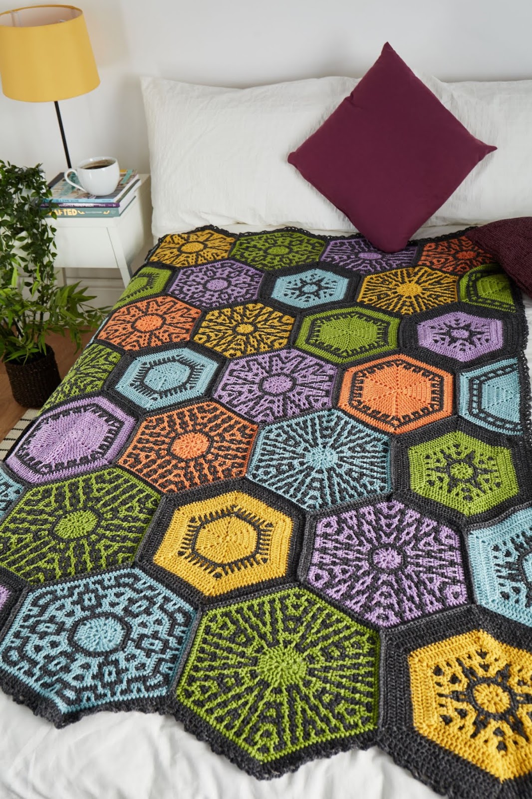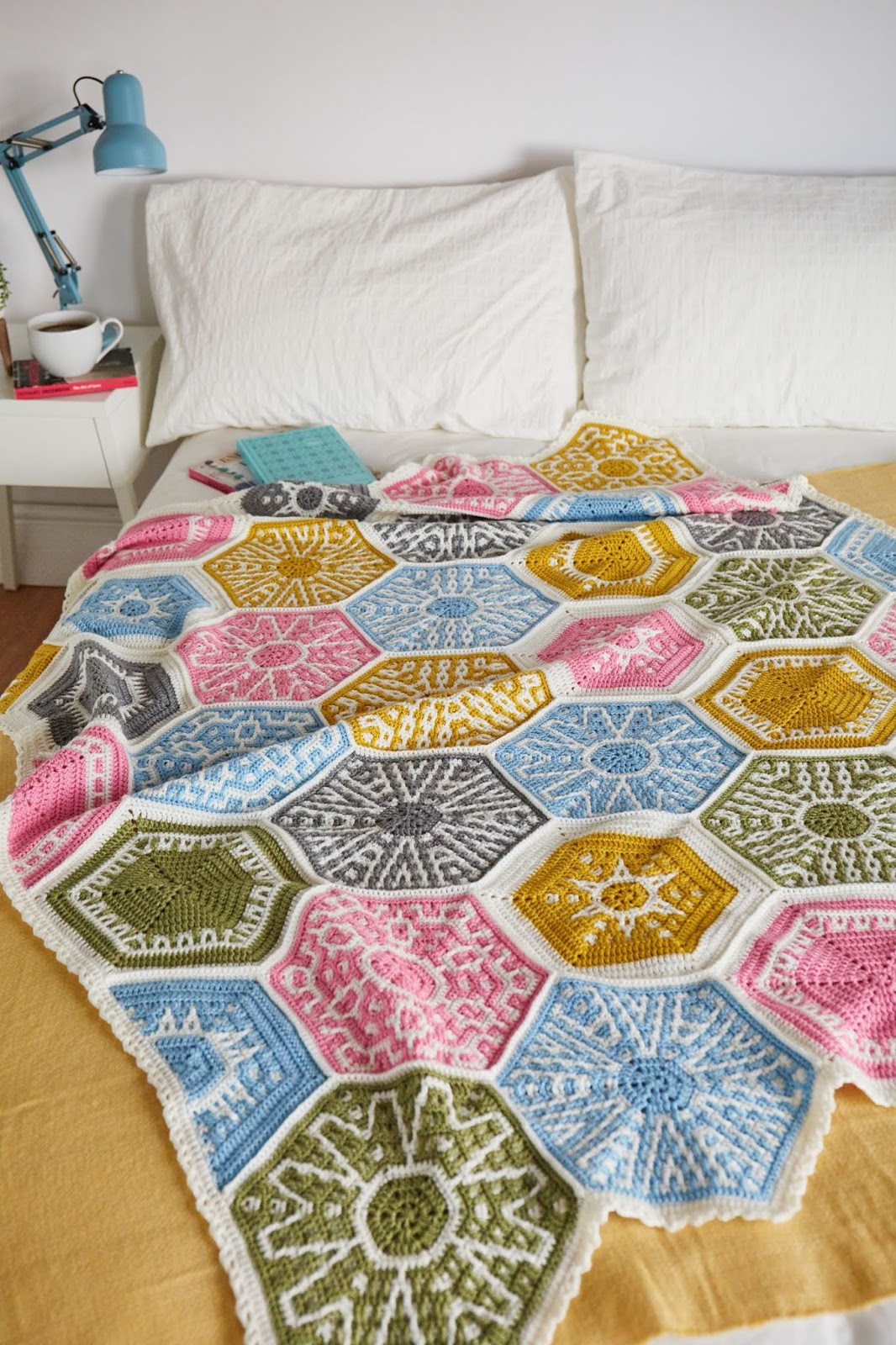 Celestia blanket is about hexagon motifs, each with a new mosaic stitch pattern. I’ve been experimenting with different shapes and hexies is one of my favourite, too. So, Celestia is a mix of several loves of mine which met together in one blanket.