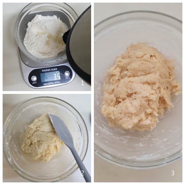 - Add bread flour in a bowl, pour the boiling water and mix well with spatula or spoon until no dry flour.