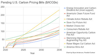 The Raise Wages Cut Carbon Act ($44/tC from 2020 rising 2.5% + inflation) and America Wins Act ($52/tC from 2020 rising 6% + inflation) would only apply to energy sector emissions.