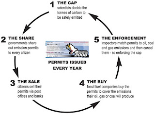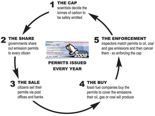 A cap and share report, commissioned by the government of Ireland, proposed every person on Earth receive a carbon certificate representing their share of the emissions budget. They could sell their certificates to their post office or bank which could then re-sell them to oil, coal, gas, cement or steel manufacturers, or other polluters.