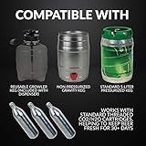 TMCRAFT - Co2 cartridge system screw co2 gas cartridges38 threadinto the regulation supply to maintains perfect carbonation 16g capsule can tap 128oz of beer Co2 cartridge not included Upgraded regulator the upgraded regulator has a more accurate psi degree finetune pressure by rotating the adjustment knob can make the beer get perfect carbonation and head Portable size 64oz capacity and the size of 77l x 53w x 136h fits standard home coolerfridge and easy to transport